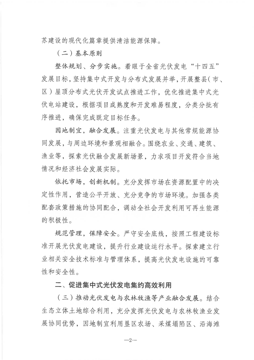 根据文件,江苏省“十四五”将坚持集中式开发与分布式发展并举,分类分批有序推进光伏项目建设。注重光伏发电与其他常规能源协同发展,与周边环境和景观相融合。围绕农业、交通、建筑、渔业等,探索光伏融合发展新场景。充分发挥市场在资源配置中的决定性作用,加强各类配套政策措施的协同配合,调动全社会开发利用可再生能源的积极性。