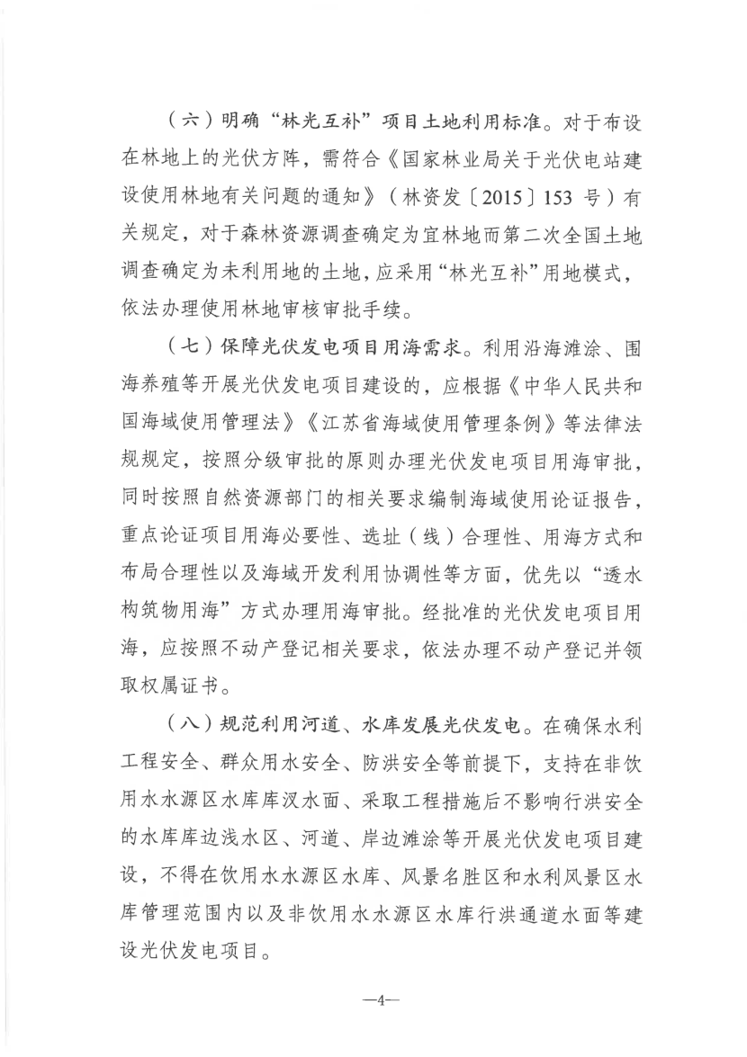 明确光伏复合项目选址原则,探索建立光伏复合项目用地负面清单制度。明确光伏复合项目土地利用标准,在不改变土地用途、不影响农业等生产的前提下,可按原地类认定,光伏复合项目中农业等复合产业年收益不得低于当地同类土地最低收益。明确“林光互补”项目土地利用标准,对于森林资源调查确定为宜林地而第二次全国土地调查确定为未利用地的土地,应采用“林光互补”用地模式。保障光伏发电项目用海需求,规范利用河道、水库发展光伏发电。