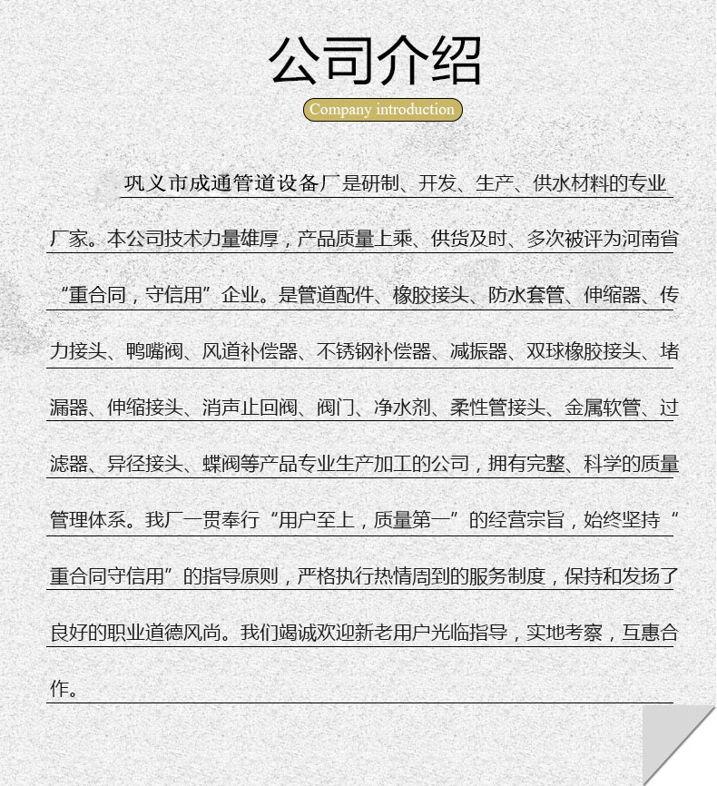 巩义市成通管道设备厂是从事研制、开发、生产钢制,橡胶管件、法兰的专业厂家。成通管道厂主要生产下列产品: