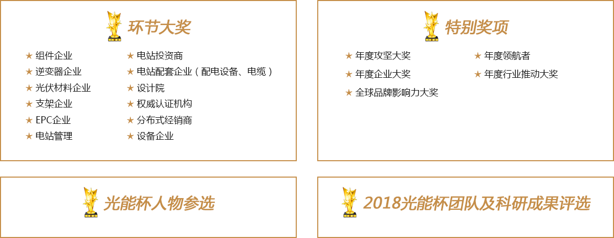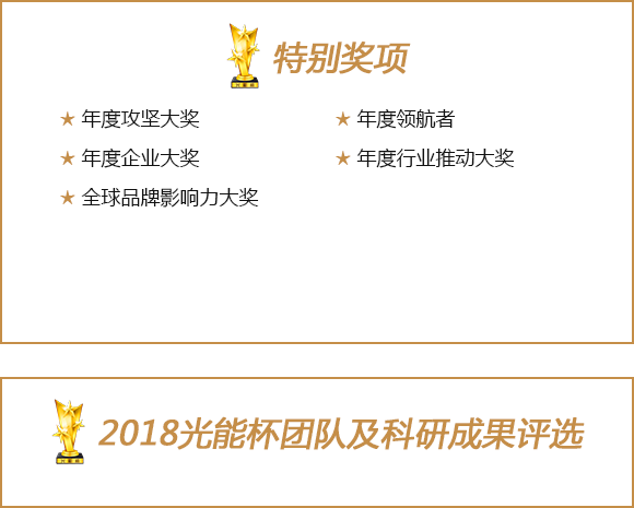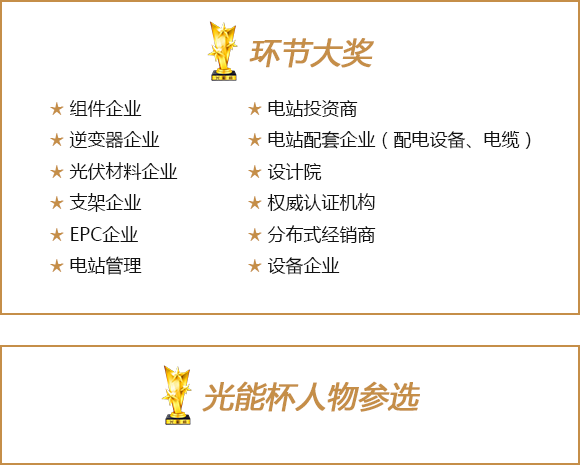 本次光能杯评选分入围与获奖两项,对于代表发展最高成就的最终获奖企业颁发唯一的相应大奖,对于取得优秀入围资格的企业颁发相应的行业优秀奖。 -