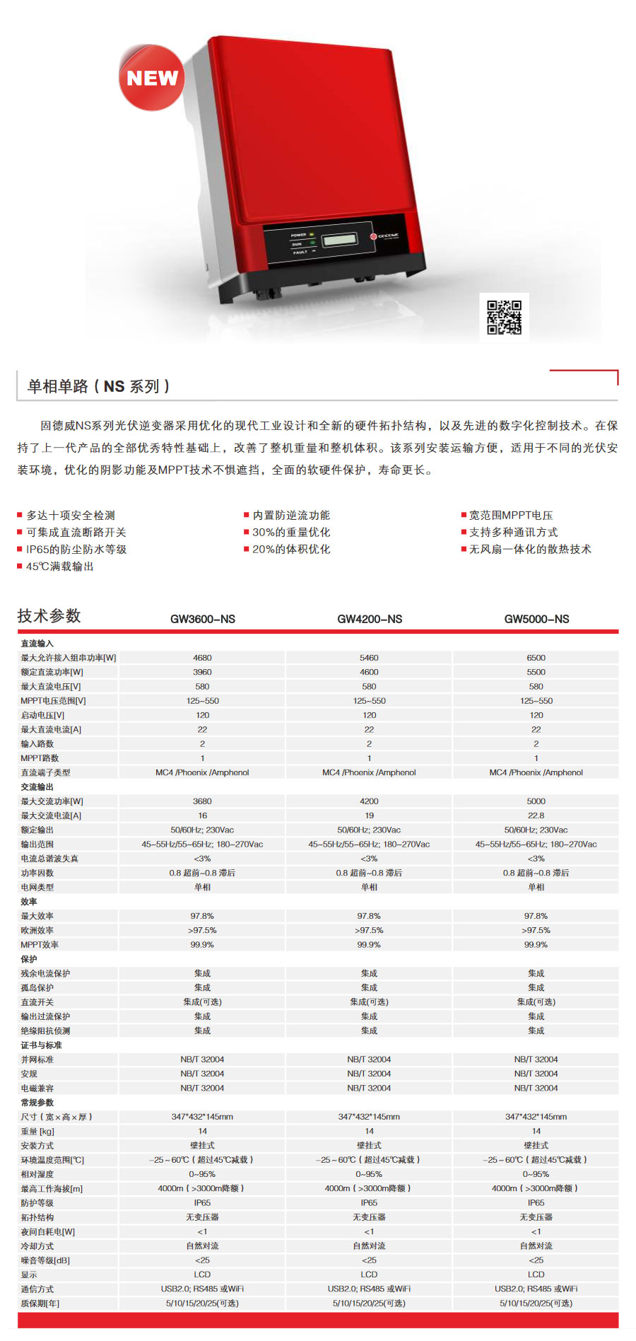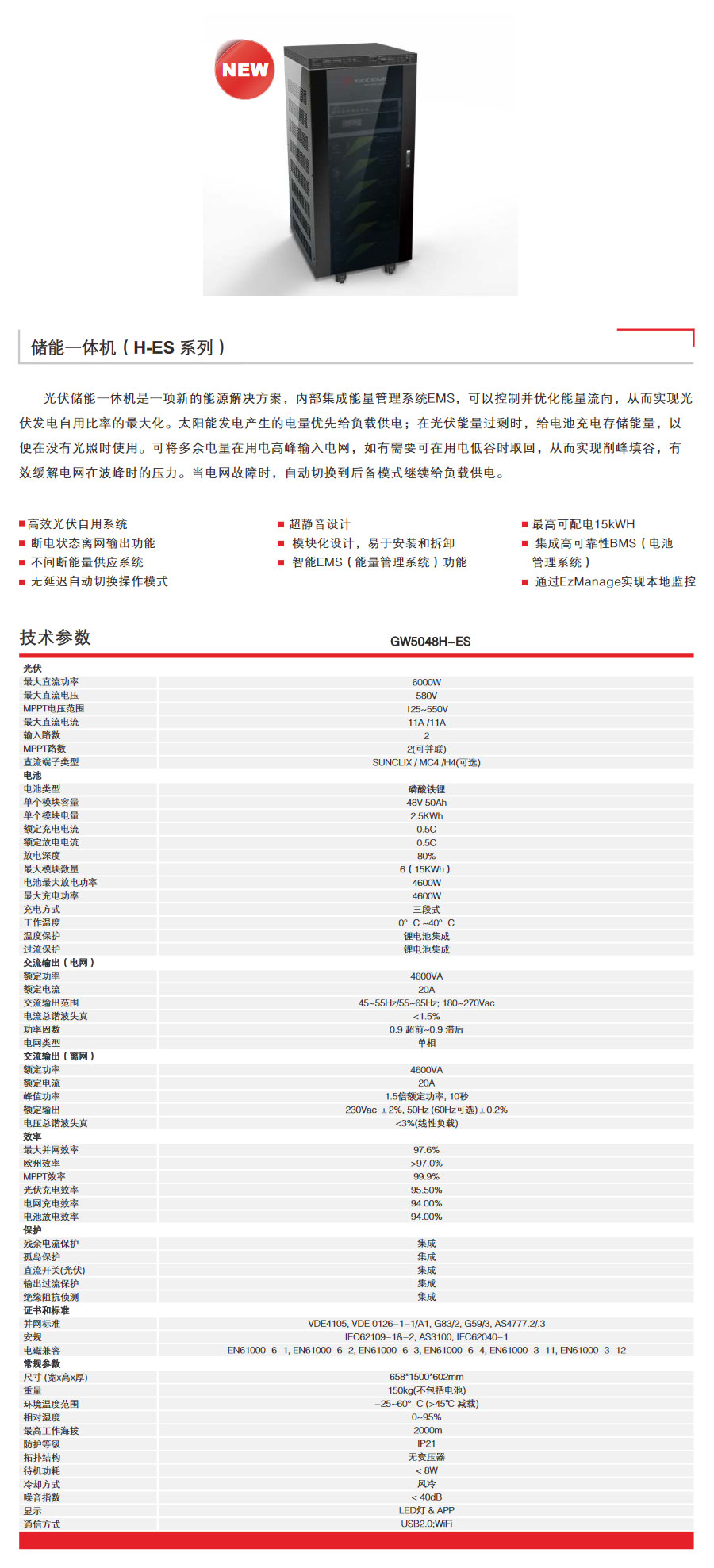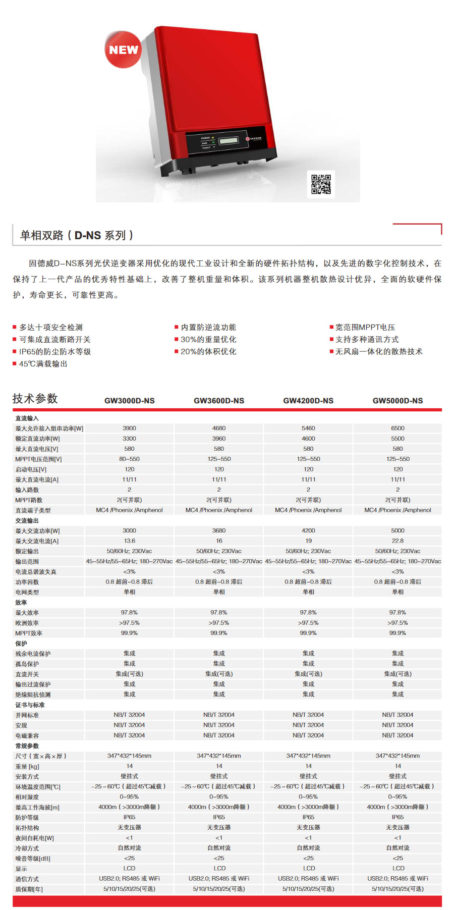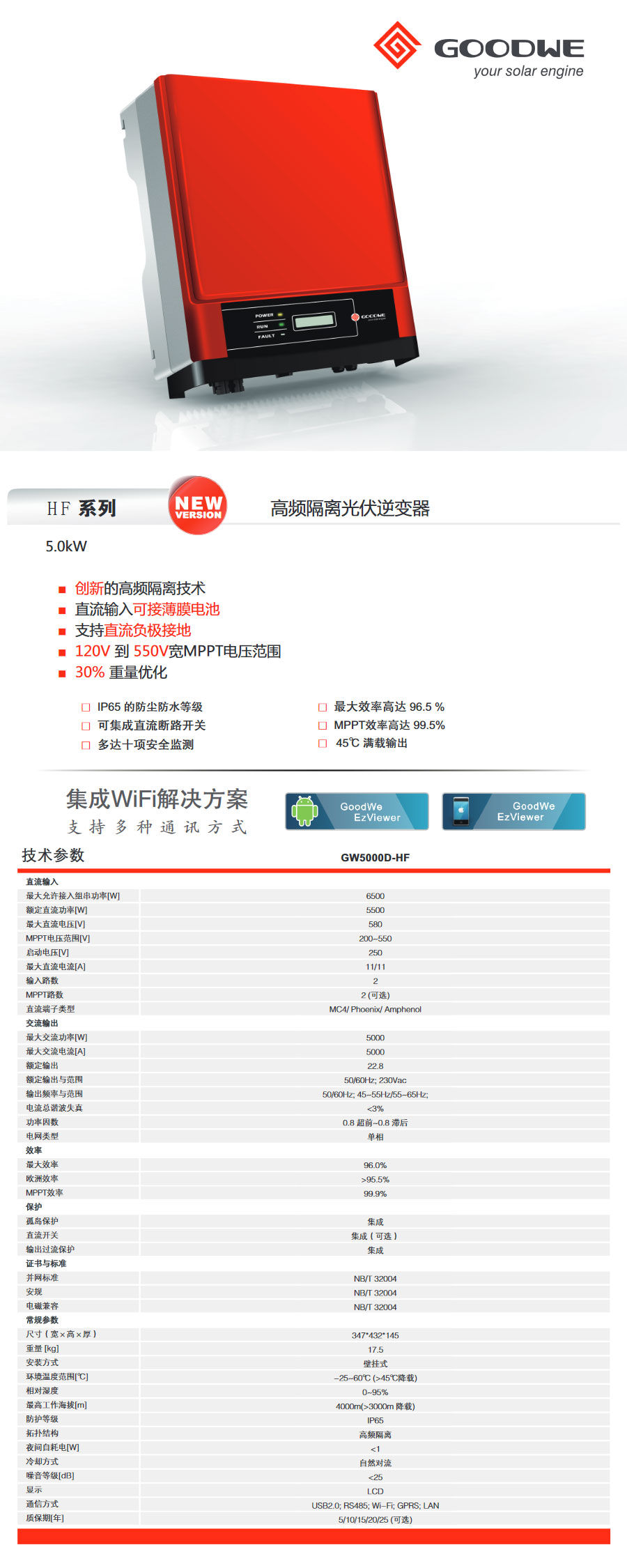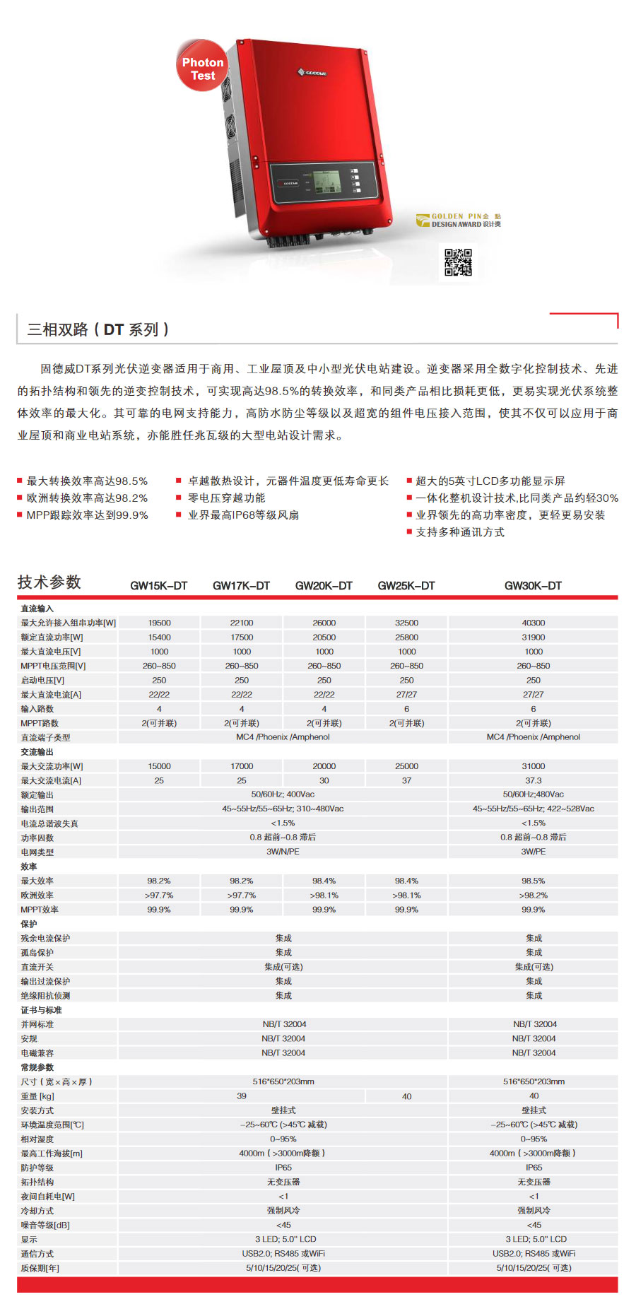固德威产品设计源自德国,生产基地在中国,现已研发生产NS单相单路、D-NS单相双路、SDT、DT三相双路、ES双向储能、BP储能转换器、H-ES储能一体机七大系列光伏产品,功率覆盖1.0kW到65kW。公司全系列光伏逆变器产品最高转换效率达到98.8%,MPP跟踪效率均可达99.9%, 总电流谐波畸变率(THDi)控制在1%以下,已达到世界一流水平。同时已开发出完整的监控产品系列和无线及互联网监控方案,以满足不同客户的多样化需求。