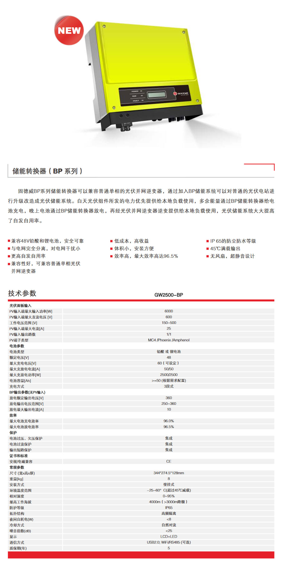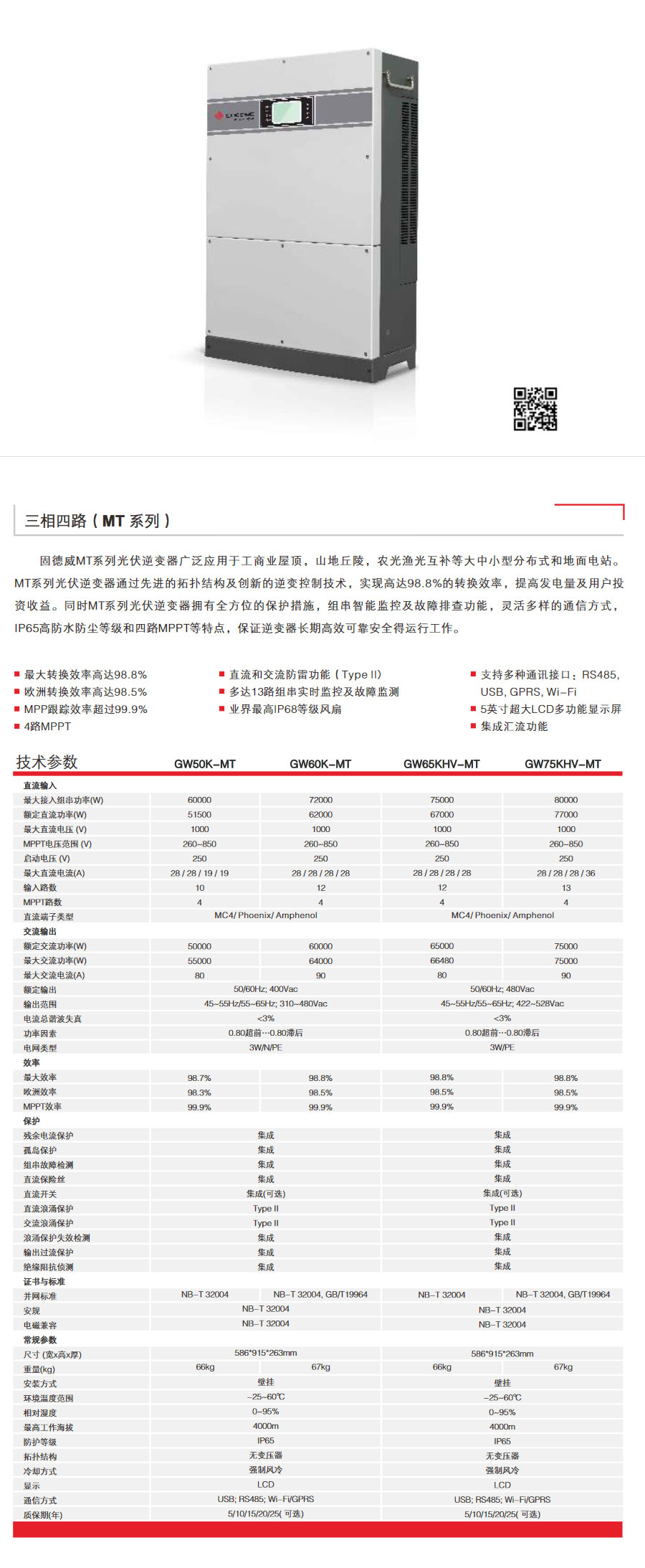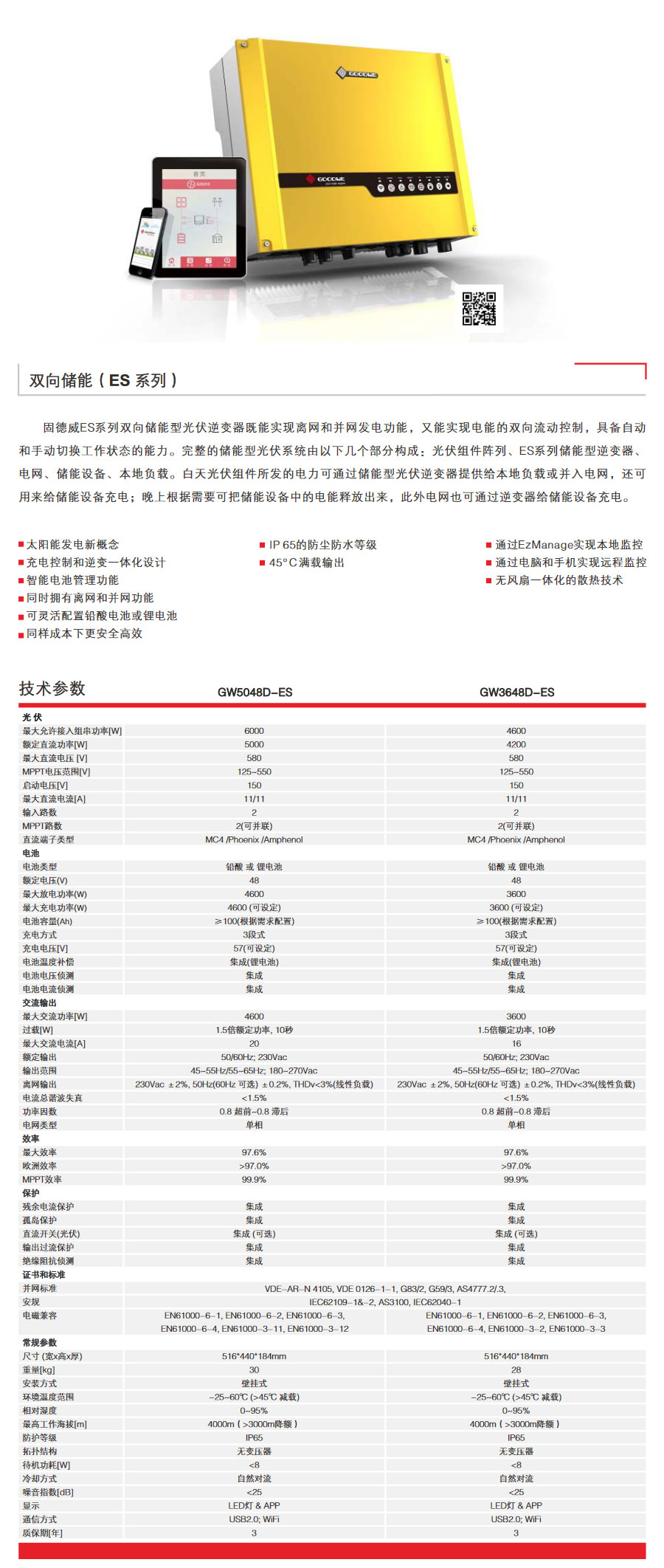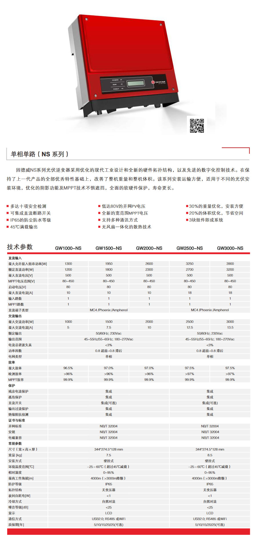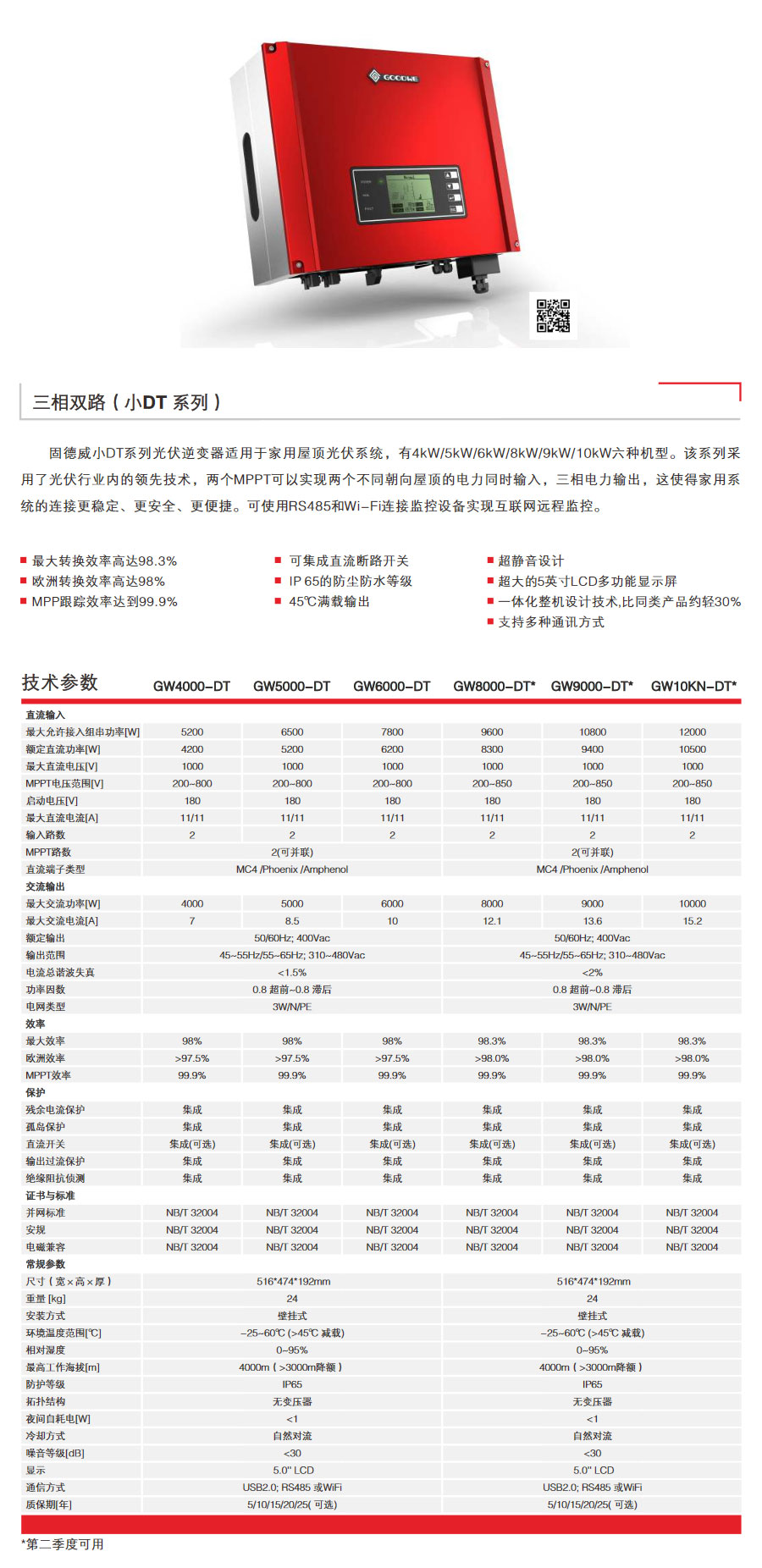 固德威产品设计源自德国,生产基地在中国,现已研发生产NS单相单路、D-NS单相双路、SDT、DT三相双路、ES双向储能、BP储能转换器、H-ES储能一体机七大系列光伏产品,功率覆盖1.0kW到65kW。公司全系列光伏逆变器产品最高转换效率达到98.8%,MPP跟踪效率均可达99.9%, 总电流谐波畸变率(THDi)控制在1%以下,已达到世界一流水平。同时已开发出完整的监控产品系列和无线及互联网监控方案,以满足不同客户的多样化需求。