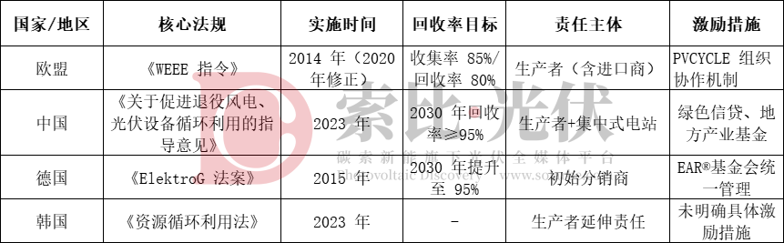 光伏组件回收产业的发展呈现出“国际先行-中国跟进-全球协同”的演进脉络,可划分为三个关键阶段。2014年前为起源期,欧盟率先通过2012年修订的《废弃电子电气设备指令》(WEEE指令 2012/19/EU)将光伏组件纳入强制回收范畴,设定分阶段目标:2012-2015年回收率75%、再利用率65%;2015-2018年回收率80%、再利用率75%;2018年后回收率85%、再利用率80%。为落实指令要求,欧盟建立生产者责任延伸(EPR)制度,由PV Cycle组织协调企业协作,会员需缴纳会费并承担处理费用。