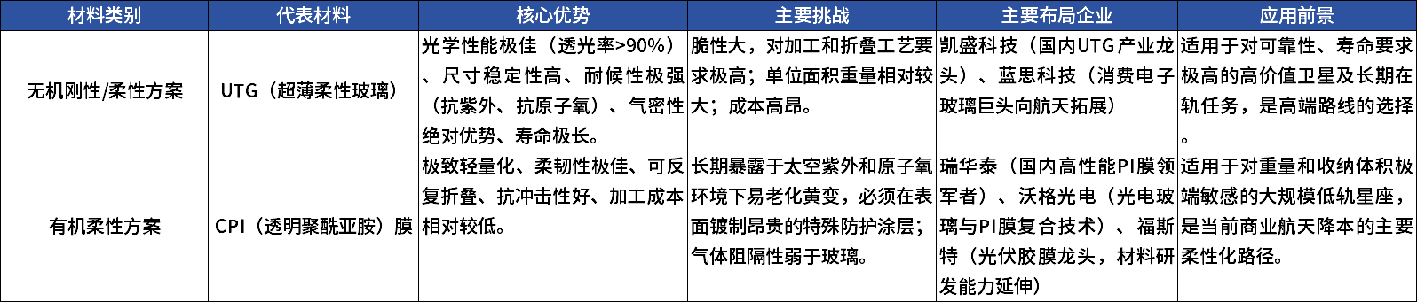 随着卫星功耗激增,太阳翼面积需求呈指数增长,柔性、轻量化、高收纳比的太阳翼成为必然趋势。其核心是柔性基板与封装材料,主要存在两大技术路径竞争: